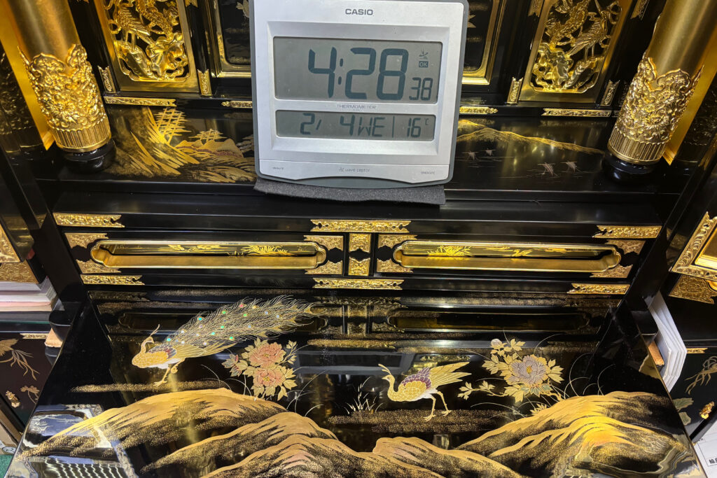 お預かりしたお仏壇は,一度全て通産大臣認定伝統工芸士・令和の名工『大坂親方』が輪島漆器の技術を活かしてリフォーム復元いたします。金箔・漆を剥いですべて分解いたします。使えない古い部材は、新しく作成いたします♬もう一度新しく漆を塗り、金箔を施します。金具・蒔絵も新しく施します。