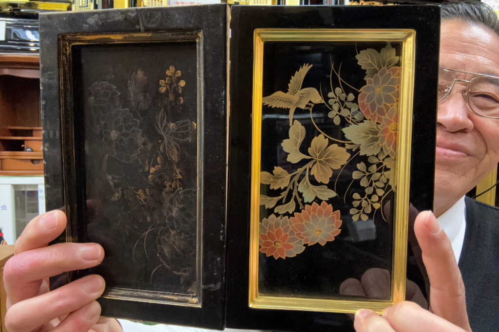 お預かりしたお仏壇は,一度全て通産大臣認定伝統工芸士・令和の名工『大坂親方』が輪島漆器の技術を活かしてリフォーム復元いたします。金箔・漆を剥いですべて分解いたします。使えない古い部材は、新しく作成いたします♬もう一度新しく漆を塗り、金箔を施します。金具・蒔絵も新しく施します。