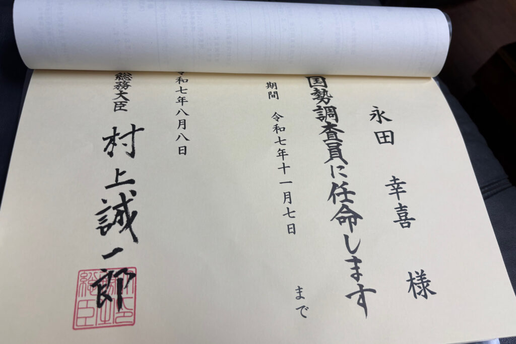 今回,国勢調査員の任命を,村上誠一郎総務大臣から任命受けました(笑)