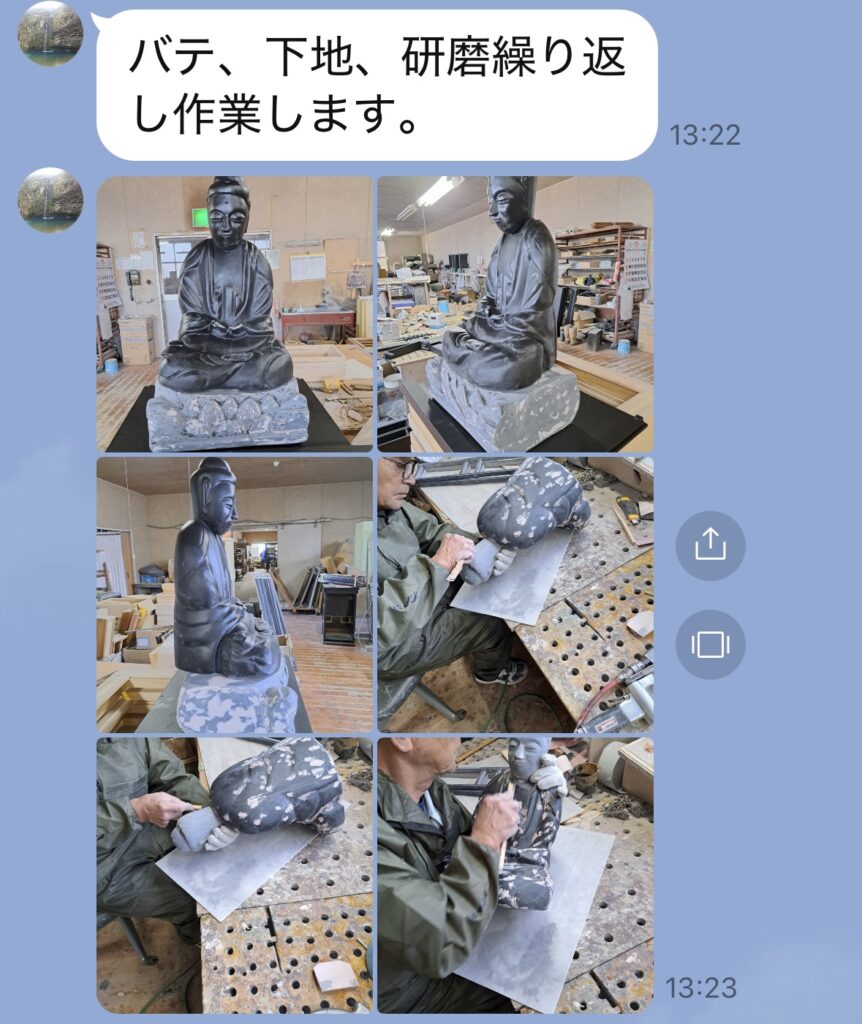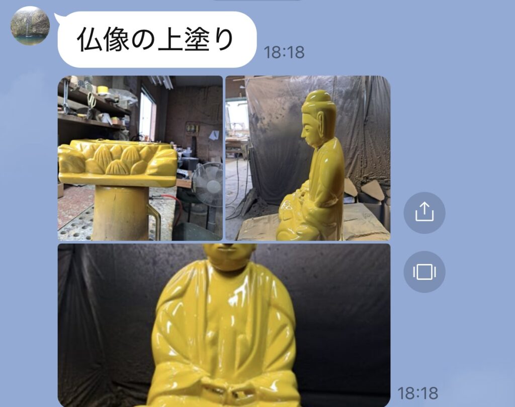 大坂親方が送っていただいた,お仏像リフォーム作業工程です。黄色いこの塗料の上に,最後国産金沢金箔を一枚一枚丁寧に貼り付けます♬