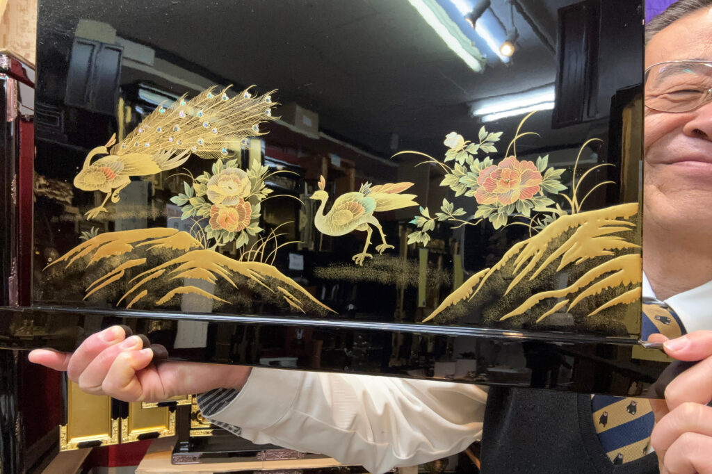 孔雀錦蒔絵は,幸福を呼ぶ素晴らしい蒔絵芸術作品と呼ばれております!