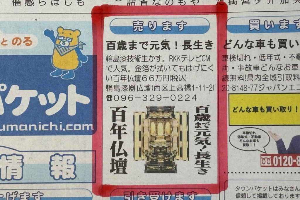 RKK水戸黄門コマーシャル・熊日新聞広告おなじみ!お客様の「百歳まで元気長生き!生涯現役応援仏壇」です*(^o^)/*