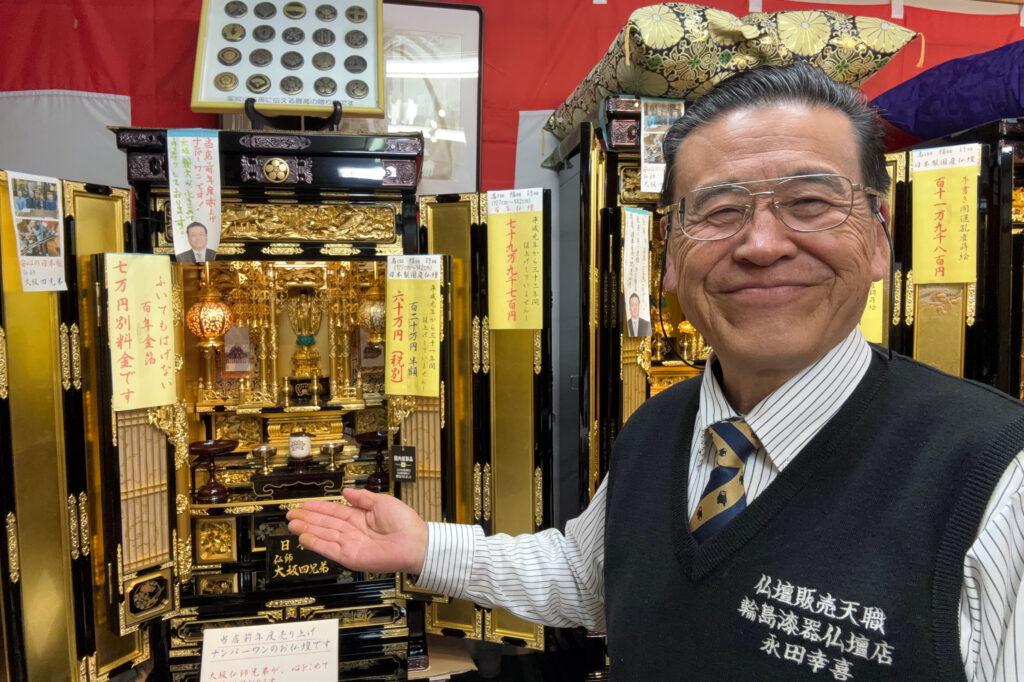 先代社長『永田孝』(父)は、輪島漆器の行商しておりました。お客様から『永田さんの輪島漆器の技術で,金箔が拭いてもハゲない仏壇作ってください』と要望いただきました。
