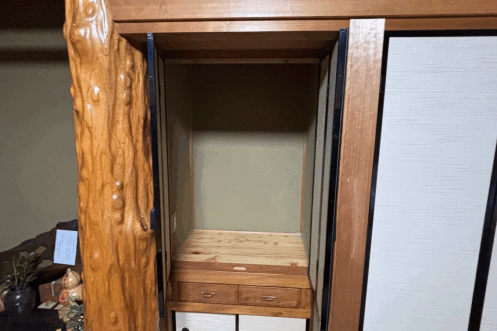 お仏間に,百年仏壇本体納入!引き出し前に,仏壇下台を置きます‼️
