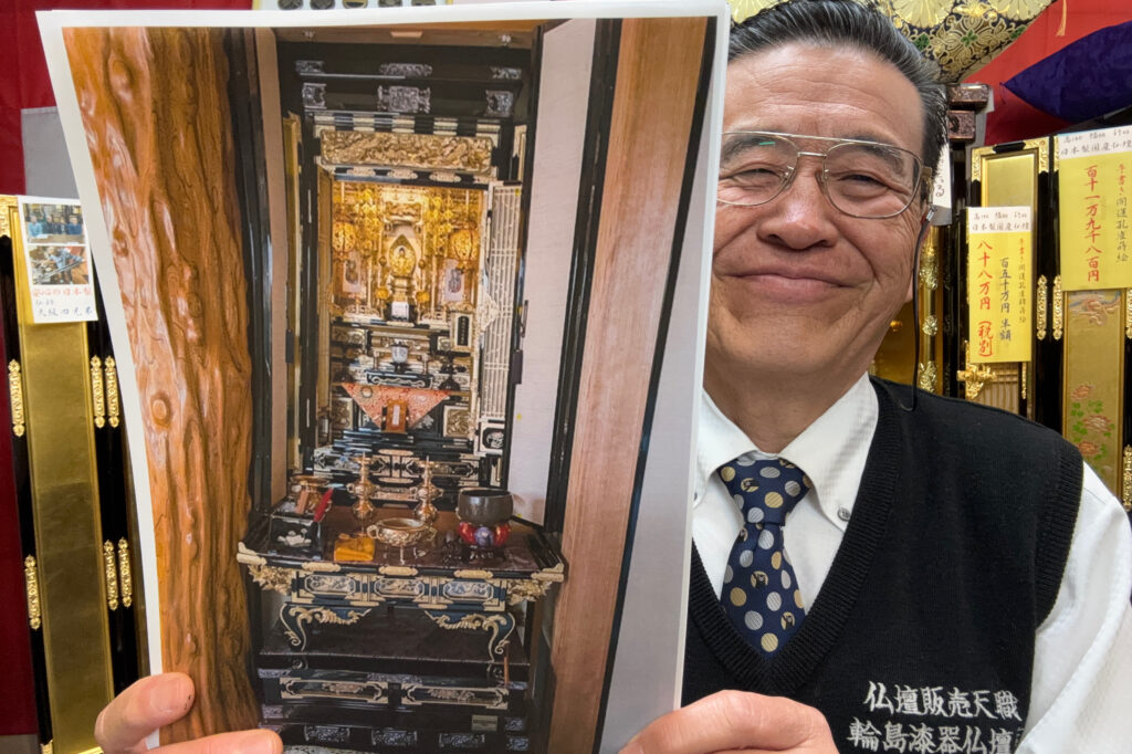 輪島漆器の技術を生かして通産大臣認定伝統工芸士「大坂(だいさか)四兄弟親方が,毎日コツコツ手作りの国産仏壇です。日本1のお仏壇と、私は確信しております!