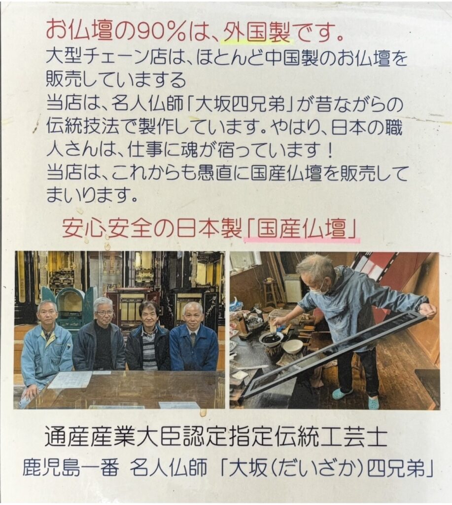 今、お仏壇はほとんど中国製です当店は国産です。国産日本製にこだわります!私の天命は、日本の仏壇職人匠の仕事を守る事です!